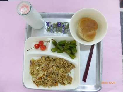 今日の献立は、1/2黒糖パン、焼きそば、オクラの中華和え、さくらんぼ、牛乳です。