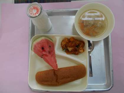今日の献立は、ライ麦パン、かぼちゃのミートグラタン、スープ、すいか、牛乳です。