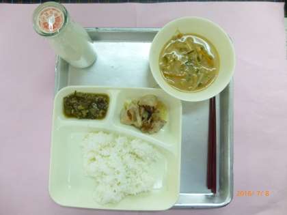 今日の献立は、ご飯、鶏肉の柚子塩焼き、味噌汁、なすのそぼろ炒め、牛乳です。