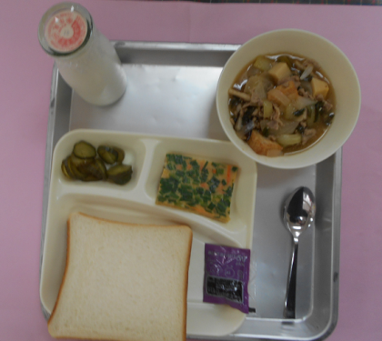 今日の献立は、食パン、ブルーベリージャム、中華煮、チヂミ、きゅうりの甘酢づけ、牛乳です。