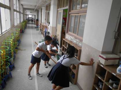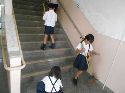 自分の教室、特別教室、便所、廊下、階段などを掃除します。