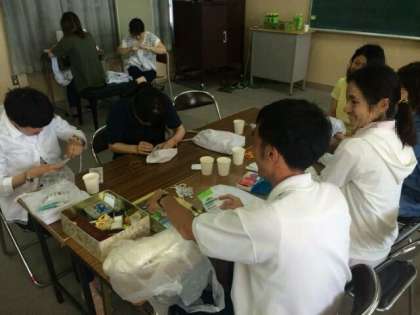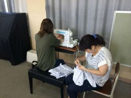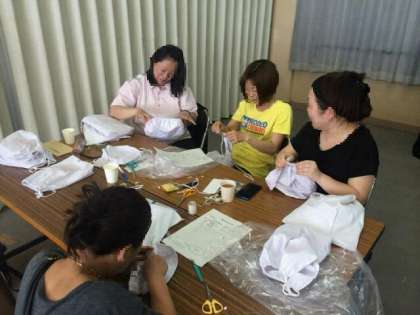 PTAの保健給食委員会が中心になり、子どもたちの給食エプロンの修理をしているところです。ゴムが伸びていたり、袖口がほつれていたり・・・いろいろ修理していただきました。