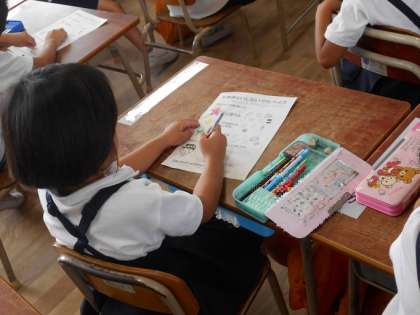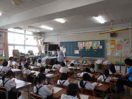 1年生の食育の授業です。子どもたちは、栄養教諭の先生の授業に、楽しそうに一生懸命取り組んでいます。