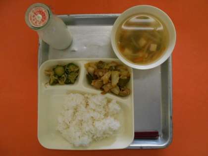 今日の献立は、ご飯、ホイコウロー、豆腐のスープ、きゅうりともやしの和え物、牛乳です。