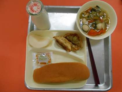 今日の献立は、コッペパン、アプリコットジャム、中華煮、揚げ餃子、なし(豊水)、牛乳です。