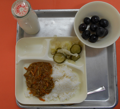 今日の献立は、ドライカレー(米粉)、グリーンサラダ、ぶどう(巨峰)、牛乳です。