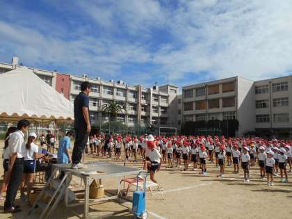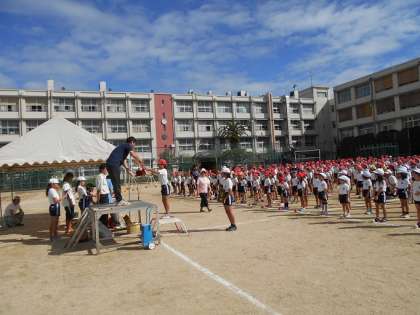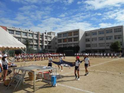 運営委員会の児童が、校旗、優勝カップ、準優勝盾をもって入場します。司会も運営委員会の児童がしています。