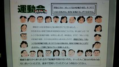 これ以上の駐輪は、学校ではできません。親戚等遠方から来られる方で、駐輪許可書のない方も、いったんご自分の児童の自宅においていただき、徒歩で登校していただきますようお伝えください。