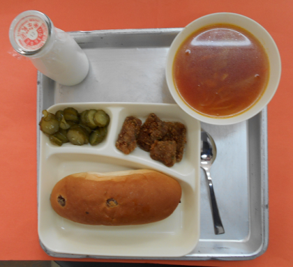 今日の献立は、レーズンパン、ミラノ風カツレツ、ミネストローネ、きゅうりのサラダ、牛乳です。