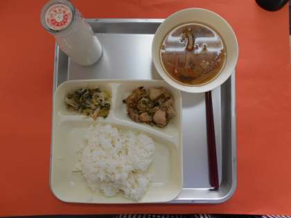 今日の献立は、ご飯、鶏肉のごまだれ焼、ソーキ汁、チンゲンサイともやしの甘酢和え、牛乳です。