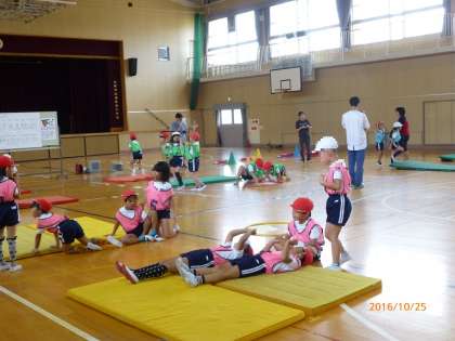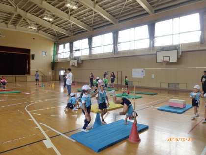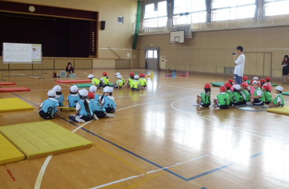 いろいろな方向への転がりや、手で支えての体の保持や回転ができること・安全に気をつけ、きまりや順番を守り仲よく活動することができること・自分に合った動きを選んで遊ぶことができることをねらいとしています。