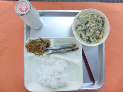 今日の献立は、ご飯、焼ししゃも、にゅうめん、きんぴらごぼう、牛乳です。
