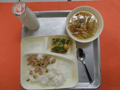 今日の献立は、ご飯、千草焼き、すまし汁、ツナと三度豆のそぼろ、牛乳です。