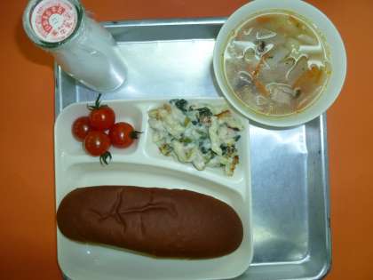 今日の献立は、黒糖パン、マカロニグラタン、大根のスープ、プチトマト、牛乳でした。