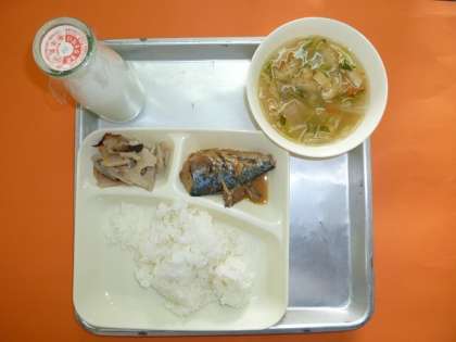 今日の献立は、ご飯、さばの味噌煮、うす葛汁、れんこんの醤油マヨネーズ焼き、牛乳でした。