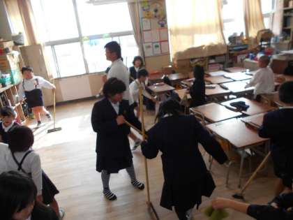 美化委員会の子どもたちが、1年生に掃除の仕方を教えています。