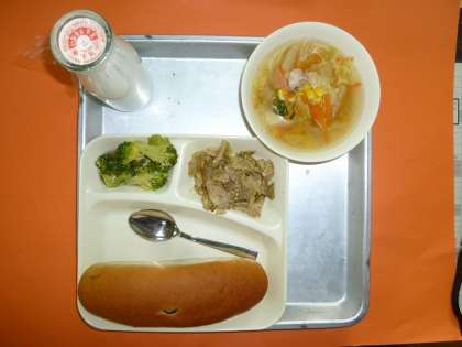 今日の献立は、レーズンパン、豚肉のカレー風味焼き、スープ、ブロッコリーのアーモンドあえ、牛乳でした。