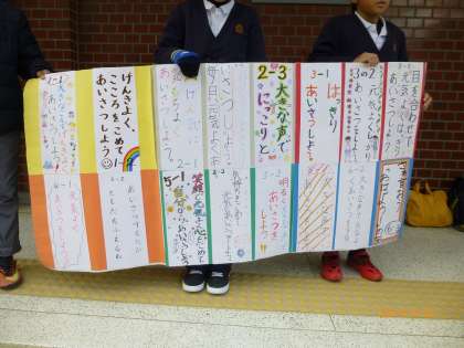 今回は、各クラスが考えた「あいさつの目標」を、運営委員会の子どもたちが、手に持ち、声をかけています。