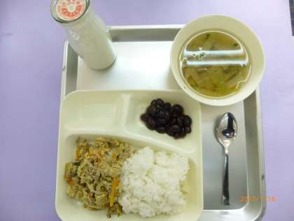 今日の献立は、他人丼、すまし汁、黒豆の煮物、牛乳です。