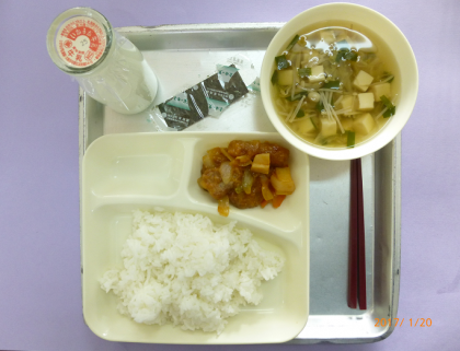 今日の献立は、ご飯、酢豚、豆腐のスープ、焼のり、牛乳です。