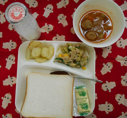 今日の献立は、食パン、ソフトマーガリン、ミートボールのケチャップ煮、ツナと野菜のソテー、焼きじゃが、牛乳です。
