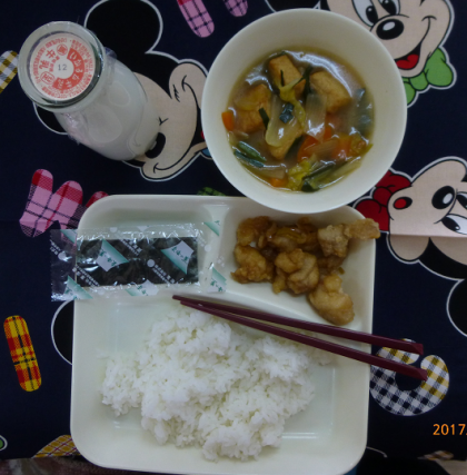 今日の献立は、ご飯、揚げ鳥のねぎだれかけ、厚揚げと白菜の中華煮、焼のり、牛乳です。