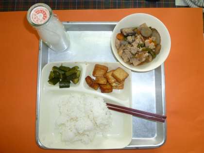 今日の献立は、ご飯、筑前煮、厚揚げの味噌だれかけ、きゅうりのかつお梅風味、牛乳でした。