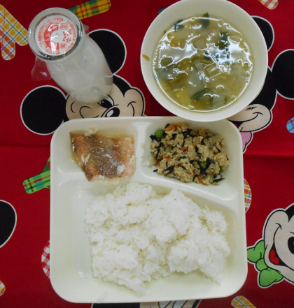 今日の献立は、ご飯、赤魚のレモン醤油かけ、うす葛汁、高野豆腐の炒り煮、牛乳です。