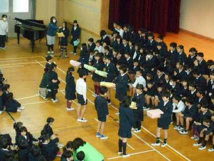 6年生から在校生に「ぞうきん」のプレゼントがありました。