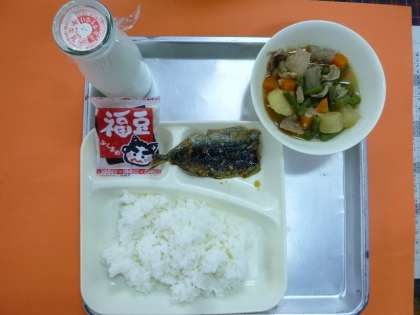 2月3日、今日の献立は、ご飯、いわしの生姜醤油かけ、豚肉と大根の煮物、いり大豆、牛乳です。