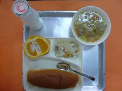 今日の献立は、黒糖パン、押し麦のグラタン、スープ、いよかん、牛乳でした。