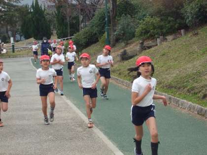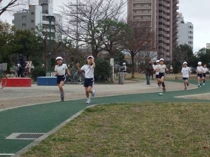 3年生の持久走の様子です。持久走のめあては、「無理のない速さで持続して走ることができるようにする」です。自分のペースで走ります。