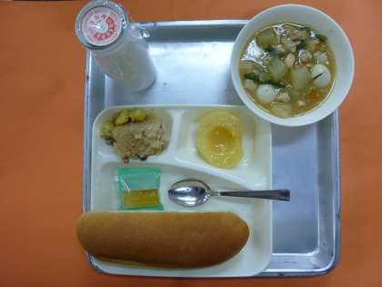 今日の献立は、コッペパン、りんごジャム、鶏肉とうずら玉子のうま煮、中華おこわ、白桃(缶)、牛乳でした。