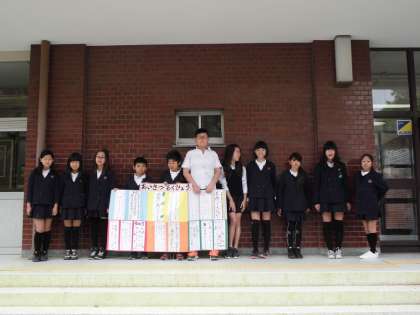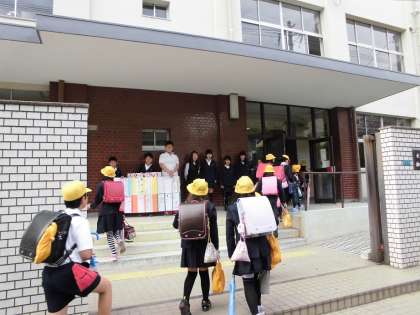 今週は、6年1組の子どもたちが、玄関で「おはようございます」と、登校してくる子どもたちを迎えています。