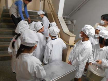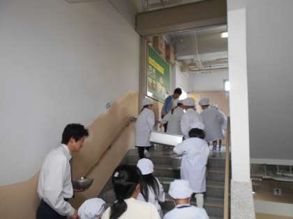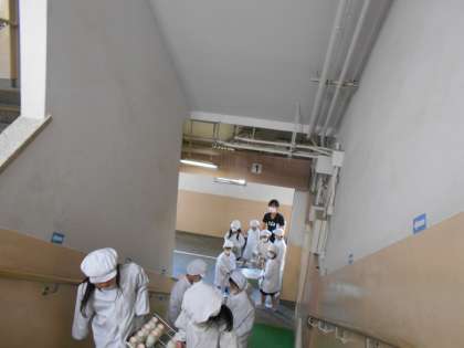 昨日までは、6年生が給食の運搬を手伝っていましたが、今日からは自分達で給食の運搬をしました。力を合わせて「よいしょ」「よいしょ」。