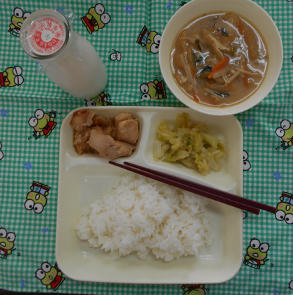 今日の献立は、ご飯、鶏肉の甘辛焼き、味噌汁、キャベツの梅風味、牛乳です。