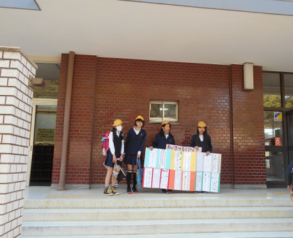 今週のあいさつ週間は、6年2組です。笑顔で「おはようございます」と声をかけています。