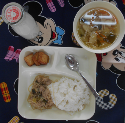 今日の献立は、豚丼、五目汁、厚揚げのしょうが醤油かけ、牛乳です。