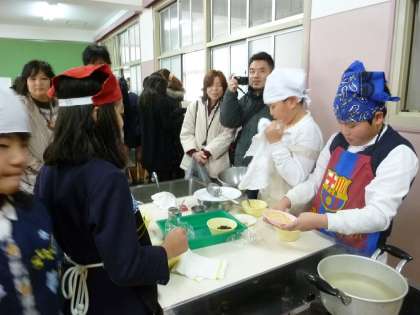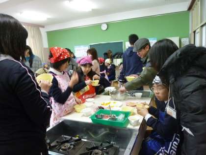 5年生の調理実習の様子です。保護者の方にも手伝ってもらって・・・。