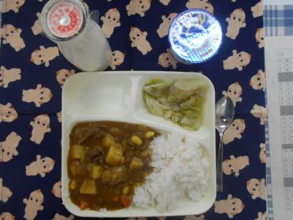 今日の献立は、牛肉と大豆のカレーライス、レタスサラダ、ヨーグルト、牛乳です。