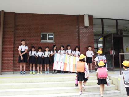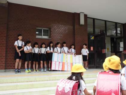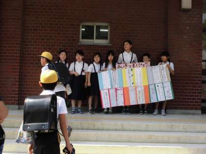 今週のあいさつ運動は、4年1組です。元気よくあいさつをしています。