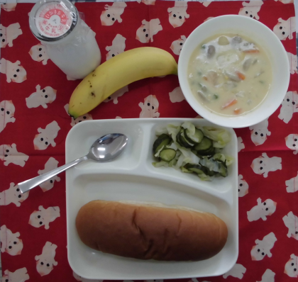 今日の献立は、黒糖パン、コーンクリームシチュー、グリーンサラダ、バナナ、牛乳です。