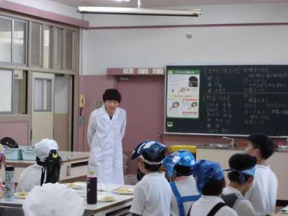 野菜を切る人、炒める人、協力して取り組んでいました。栄養教諭の先生から野菜についてのお話も聞きました。