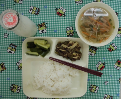 今日の献立は、ご飯、チンジャオニューロウスー、ハムと野菜の中華スープ、きゅうりのからみづけ、牛乳です。