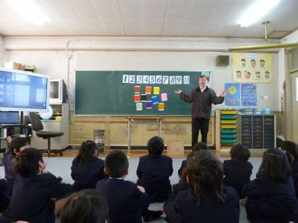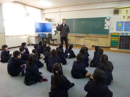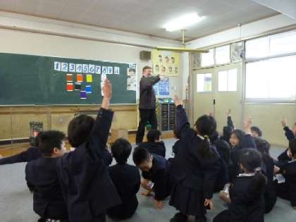 今日は、1年生がJ先生と一緒に英語の学習をしました。