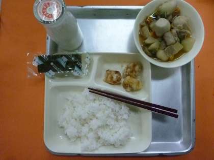 3月20日の給食は、たこの天ぷら、豚肉と里芋の煮物、焼き海苔、牛乳でした。1年間の給食が終わりました。