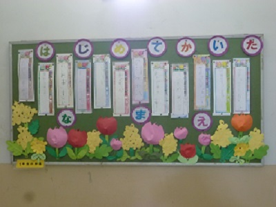 1年生の掲示板には、はじめて書いた名前が掲示してありました。一生懸命書いている様子がわかります。