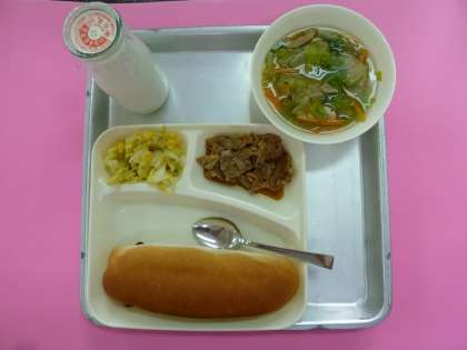 今日の献立は、レーズンパン、豚肉のデミグラスソース、レタスのスープ、サワーソテー、牛乳です。
