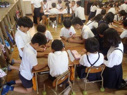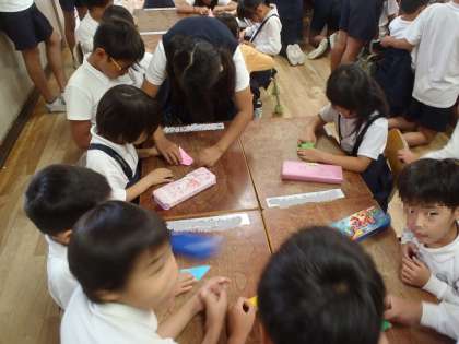 平和集会に向けて、1年生と6年生で折鶴を作りました。
