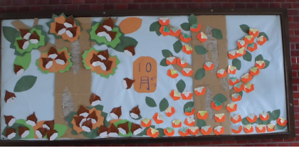正門の掲示板は、1年生の作品です。